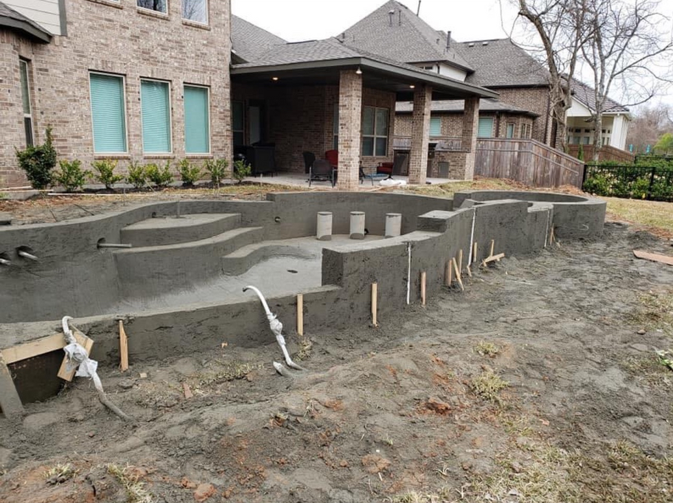 This project showcases various stages of swimming pool construction, including the initial groundwork, concrete shell construction, and the addition of surrounding features such as rocks and plants.